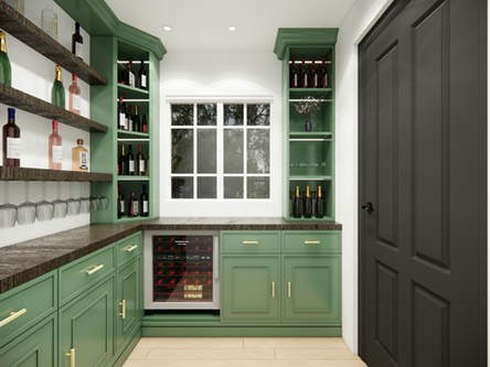 Custom sage green cabinets form an elegant L-shape, accented with gold pulls that add just the right touch of sophistication. A rich butcher block countertop anchors the design, while matching custom shelving and wine racks provide both storage and display—tying the entire space together.